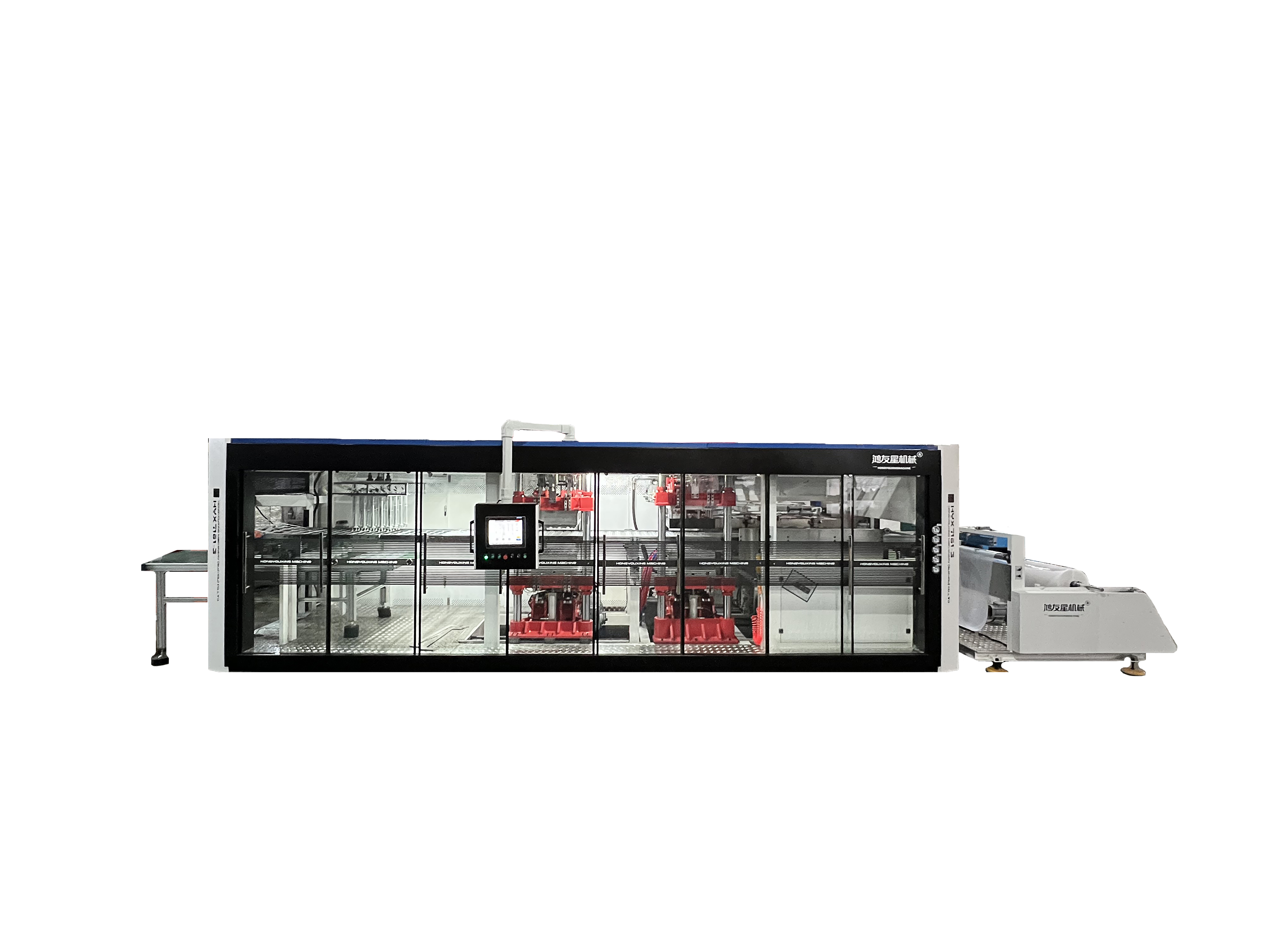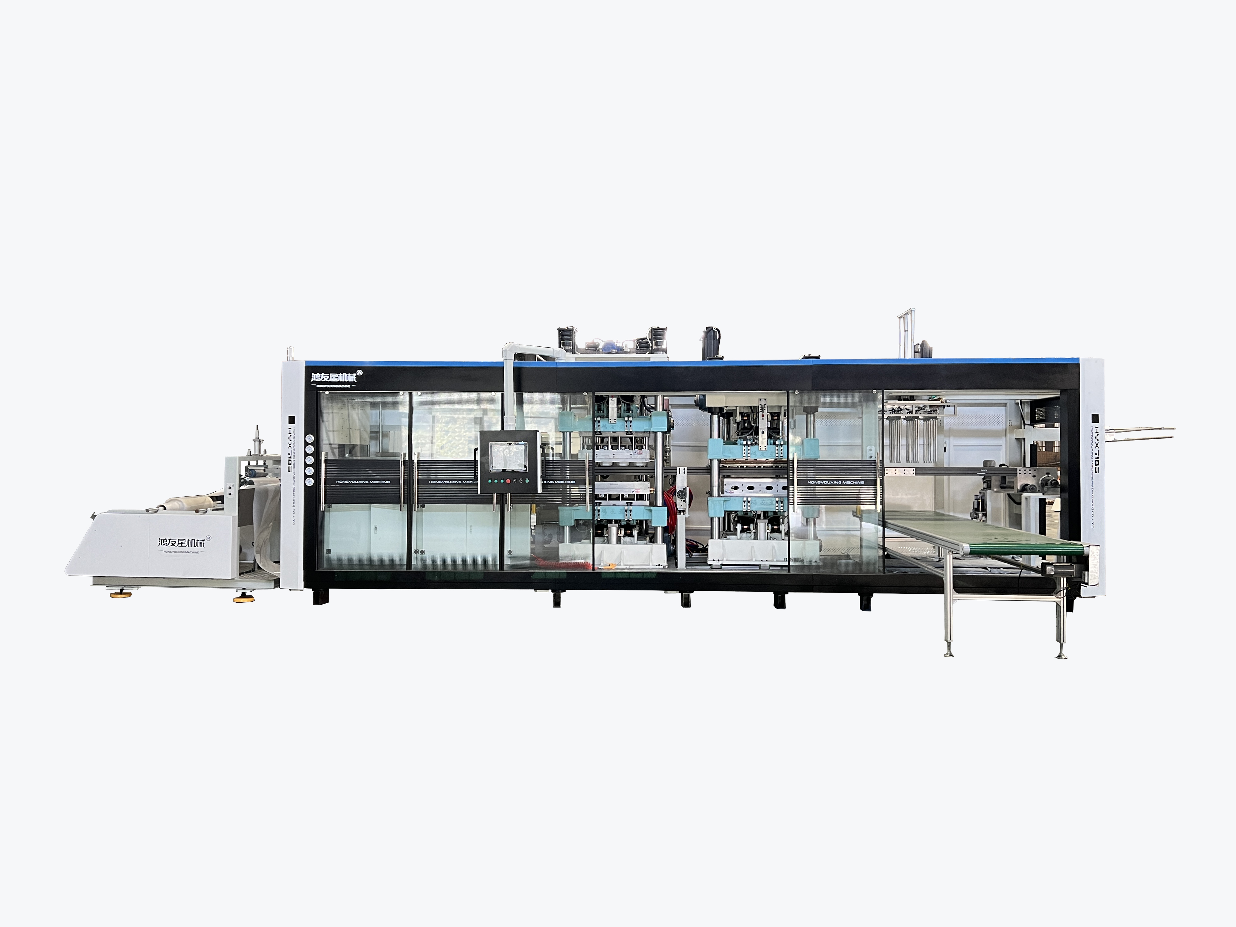 我們的主要產(chǎn)品有 HYX-850全自動正負壓3/4工位熱成型機(成型-裁切-沖孔-堆疊)、 HYX-1220 PLC全電腦控制自動真空熱成型機、 HW-7072負壓成型裁切一體機(成型-裁切-堆疊)、 HW-730自動氣壓成型杯蓋碗機、 厚片吸塑機、 30-150T液壓裁斷機、 冷水機和空壓機等輔機、 熱成型模具。